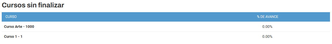 Por último, encontrará la sección de Cursos sin finalizar, en esta parte se mostrará un detalle de los cursos a los cuales se inscribió o confirmó asistencia y no culminó, es decir, no se visualizó el contenido del curso y no se completaron las evaluaciones. Además, podrá visualizar el porcentaje de avance en el que quedo el mismo.