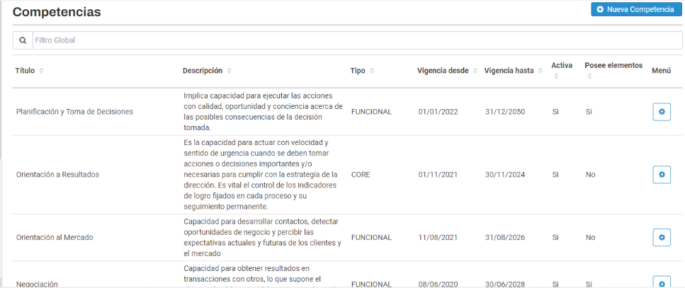 Desde esta pantalla se previsualizarán datos de las competencias tales como el título, la descripción, el tipo de competencias, vigencias, estados, si poseen elementos o no. Desde el Menú se podrán editar las mismas, o eliminarlas siempre y cuando no hayan sido utilizadas en ningún estudio.