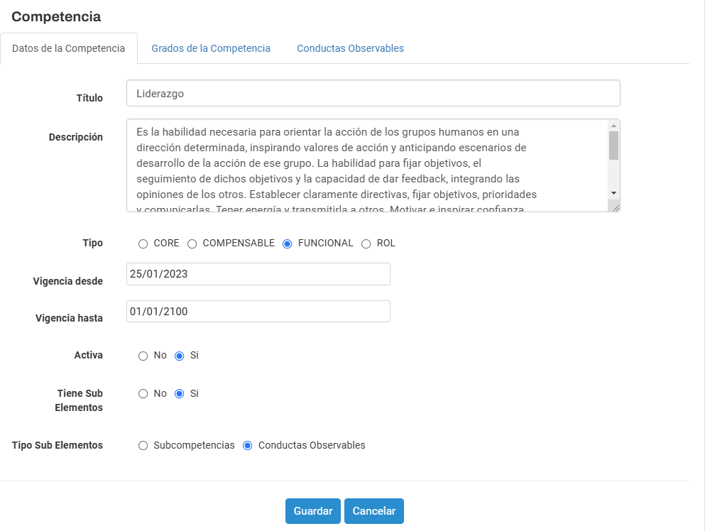 - Vigencia desde/Vigencia hasta: Periodo en el que se utilizará la competencia.