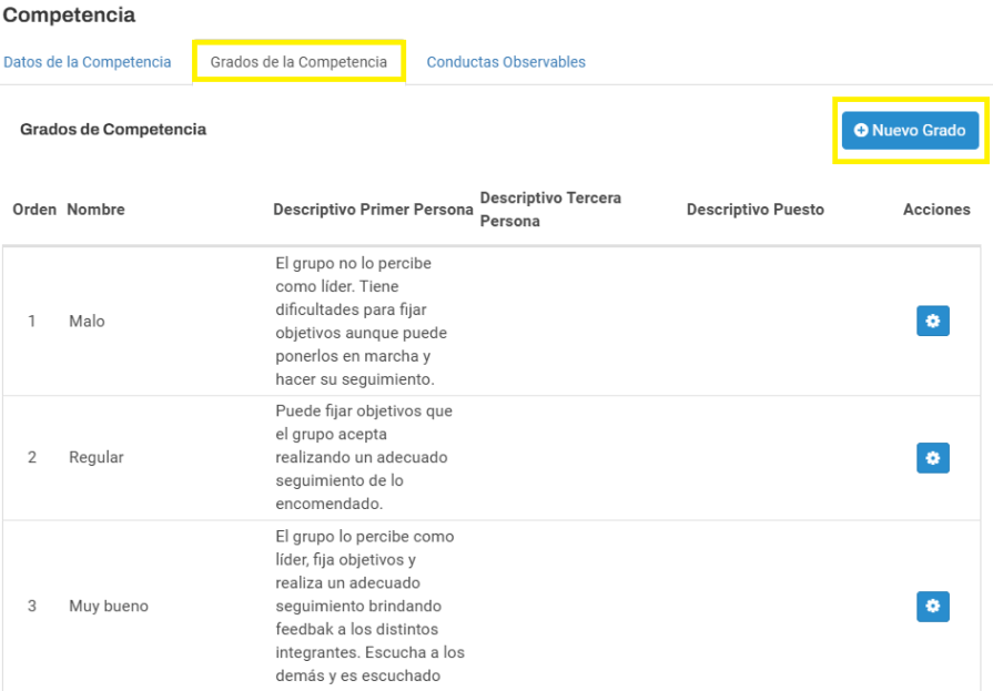 Para utilizar el modelo de competencias + grados, se deberá hacer click en el botón “Nueva Competencia” que aparece del lado superior derecho.