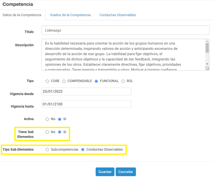 En caso de querer utilizar el modelo de Competencias + Grados + Conductas Observables, se deberá seleccionar en “Tiene Sub Elementos” > SI, y como se llamará ese Sub Elemento, Subcompetencias o Conductas Observables.