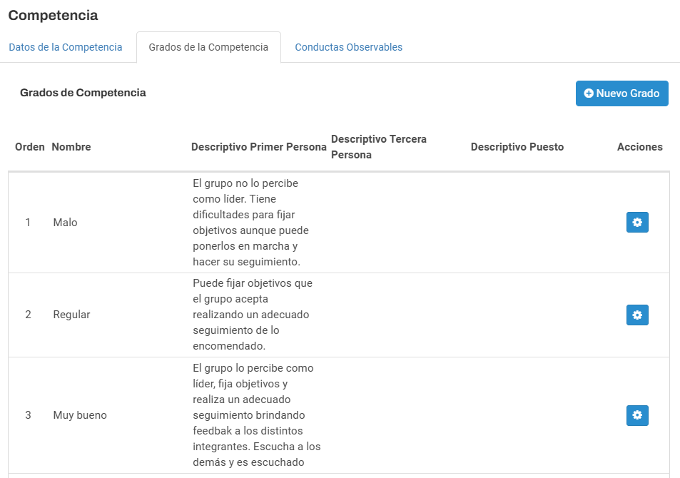 - Nombre: nombre del grado dependiendo de los grados que utilice la organización. (Por ejemplo: Malo, Bueno, Regular, Etc.)