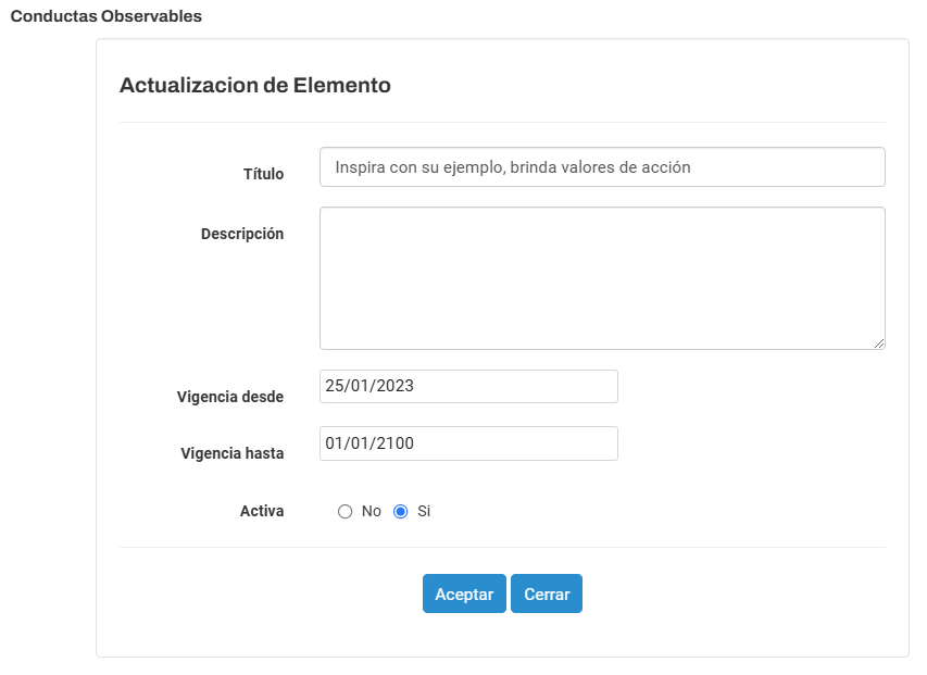 A través del botón “Nuevo Elemento” se cargarán las conductas observables correspondientes a la competencia.