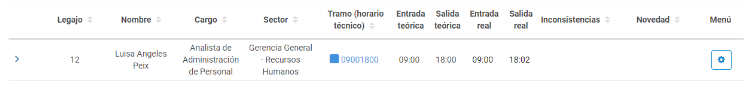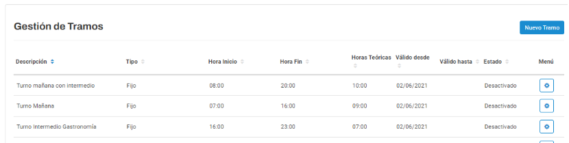 - Tramo (Horario técnico): Horario teórico asignado a la jornada de trabajo.