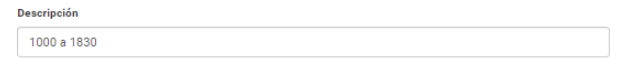 La primera opción que debemos completar es campo “Descripción” que indica el nombre del Horario. En el nombre del tramo podemos usar tanto letras como números por lo que será posible crear horarios como Turno mañana o 0900 a 1800. Ejemplo: