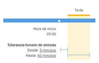 Tolerancia Desde: Indica a partir de que minuto se considera llegada tarde. Por ejemplo, en caso de poner 5 minutos, será considerada llegada tarde a partir del minuto 6. Ejemplo con un valor de 5 minutos: