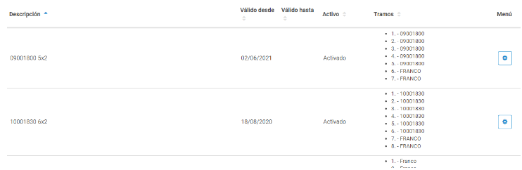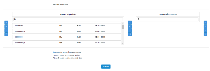 Tramos disponibles: Contiene todos los horarios creados en “Tramos”.