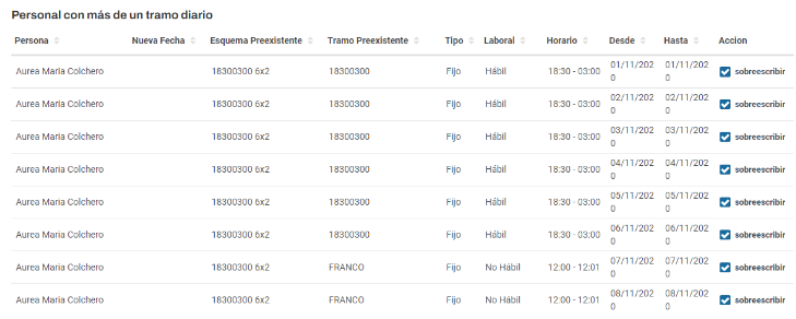 Se nos presentará una tabla con los horarios actuales de los colaboradores con la posibilidad de seleccionar los horarios que debemos reemplazar y cuales no queremos modificar: