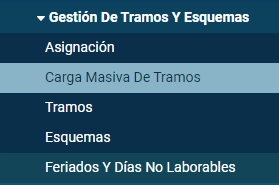 Dentro del submenú “Carga masiva de tramos” dentro del menú “Cargas masivas” se puede realizar una carga de horarios mediante Excel: