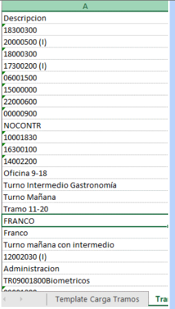 Esta carga masiva de horarios nos permite cargar cualquier combinación de horarios que no contemplen un esquema específico y por tal motivo se deba cargar de manera específica con este template.