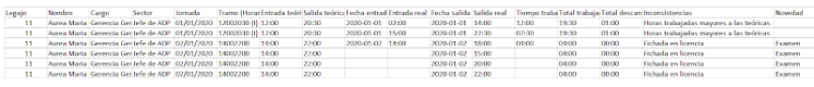 - "Horas trabajas mayores a las teóricas”: El horario real es mayor al teórico y se supera la tolerancia configurada en configuración de ausentismo. En un tramo configurado en "ABM Tramos" como "Día hábil" "Si".