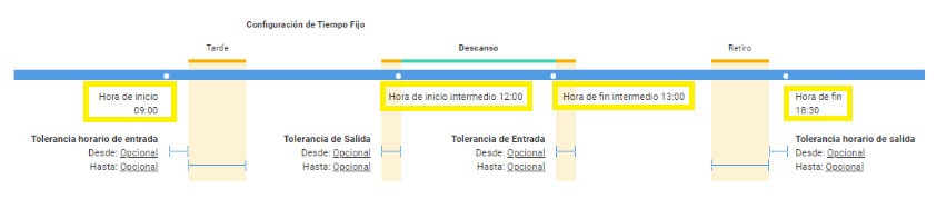 - Tiempo Fijo: El horario tiene un horario de inicio y uno de fin definido. También puede tener un Inicio del descanso y un fin del descanso.