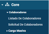 Al ingresar a “Core”, Colaboradores, Carga Masiva, Colaboradores/listas podrán obtenerse reportes de la información de la nómina que se encuentra cargada en el sistema y realizar cargas masivas de colaboradores, ya sean modificaciones en la información o el ingreso de nuevas altas al sistema.