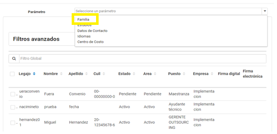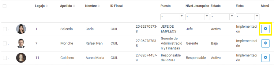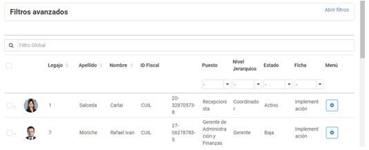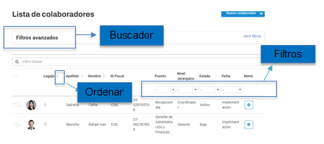 Por cada uno de estos datos podrán generarse filtros para optimizar la búsqueda, esto posicionándose debajo del campo por el cual deseen filtrar y buscando entre las opciones del desplegable. También podrá ordenar la lista según un campo, e ingresar datos claves en el buscador como CUIL, legajo o nombres para buscar a un colaborador en particular.