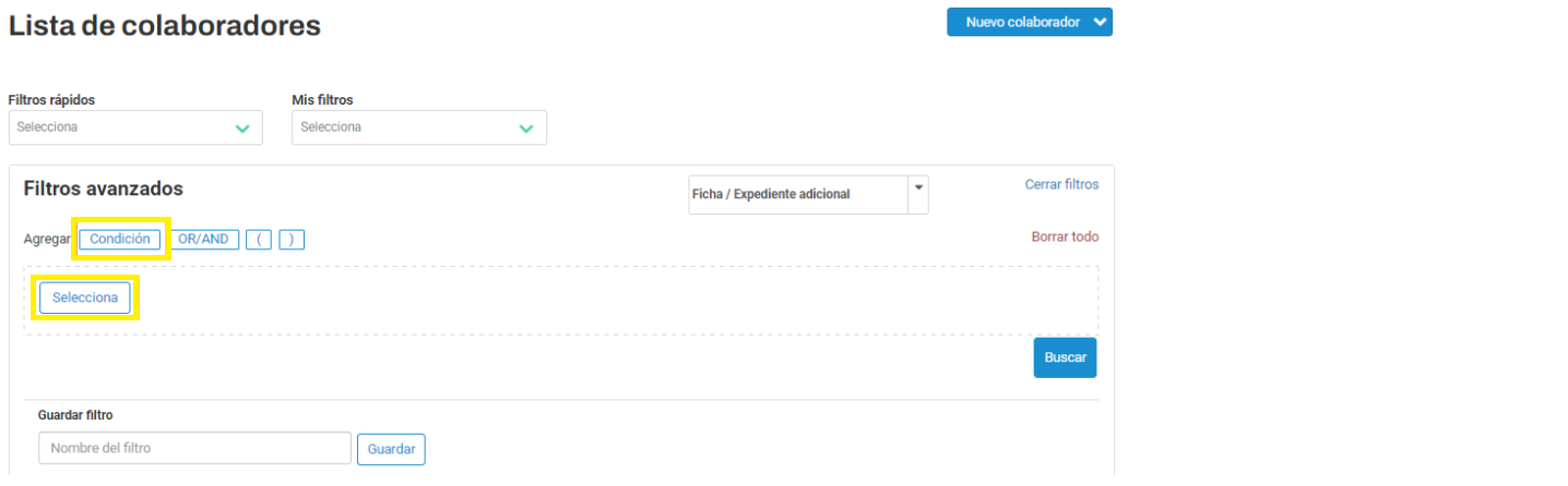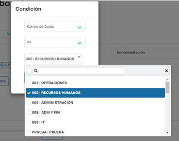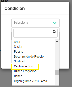 También podrán crear filtros avanzados en base a condiciones y conectores lógicos de cualquier campo de información de los colaboradores. Por ejemplo, establecer un filtro que dé como resultado únicamente a los colaboradores con determinado centro de costo, esto se haría estableciendo una condición que diga que el campo Centro de Costo de la ficha del colaborador debe ser igual a “x” centro de costo.