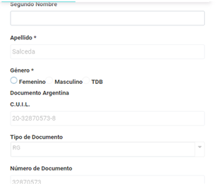 - Número de documento: Se ingresará en números y/o letras (según país) el documento del colaborador. En el caso de Argentina, el sistema comprobará que los 8 dígitos del CUIL coincidan con los dígitos del campo de documento.