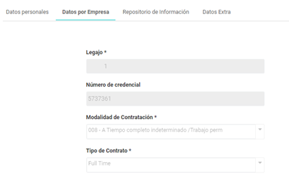 En la opción “Ver” se obtendrá una visualización de los datos que hayan sido cargados en la ficha del colaborador, separados en distintas solapas, Datos personales, Datos por empresa, Repositorio de Información y Datos Extra.