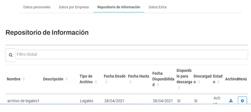 En el caso que en el “Repositorio de Información” del colaborador se haya indicado que el archivo se encontrará disponible para su descarga, a partir de la fecha indicada el colaborador podrá visualizar este archivo dentro de su Dashboard, en el “Repositorio de Documentos”.
