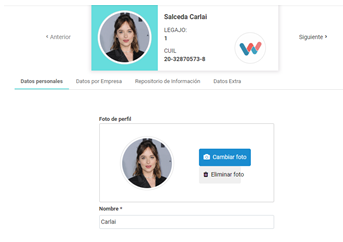 En la opción Editar se visualizarán todos los datos de la ficha del colaborador divididos en cuatro solapas: “Datos personales”, “Datos por empresa”, “Repositorio de Información” y “Datos Extra”. En este caso podrán modificar cualquiera de estos datos, así como cargar nueva información.