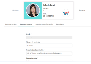 - Número de credencial: En caso de contar con una credencial por ejemplo para el acceso a la empresa, puede indicarse el código en este campo.