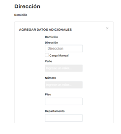 Domicilio: Este campo se encuentra linkeado con maps y permite ingresar una dirección y que se autocompleten los campos como provincia, código postal y país. También se cuenta con la opción de seleccionar el casillero “Carga Manual” y completar de manera individual cada uno de estos datos.