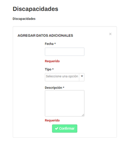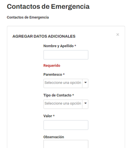 Contacto de emergencia y discapacidades: Pueden contar con más de un valor según corresponda, en cada dato se cargará la información necesaria en caso de contar con ella. Para poder agregar el valor a la ficha, habrá que completar los campos que hayan sido seteados como confidenciales.