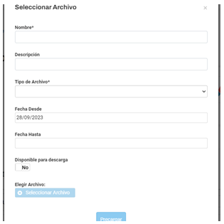 Desde el botón “Precargar Archivo” se indicará nombre del mismo, tipo de archivo, fecha desde y hasta (en caso de ser necesario), si estará disponible para la descarga del colaborador desde su Self Service y en ese caso desde que fecha estará disponible.