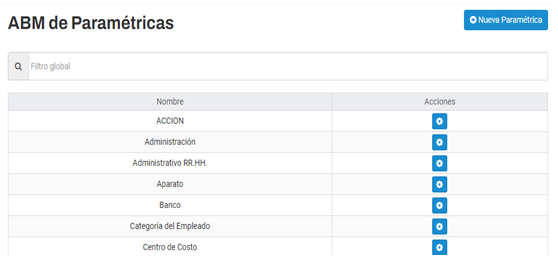 Al ingresa al módulo se visualiza la lista de campos que contienen desplegables, pudiendo filtrar desde el buscador. Desde el menú del lado derecho de cada paramétrica, “Acciones”, podrá verse o editarse la paramétrica.