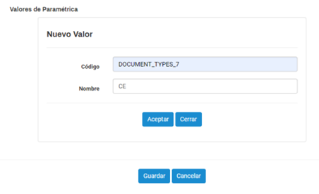 Al ingresar a “Editar” podrá editar un valor preexistente desde su menú del lado derecho, o bien agregar nuevos valores para esta paramétrica desde el botón “Nuevo Valor”. En el caso del nuevo valor deberá continuarse el código correlativo de la paramétrica y crear el nombre que quiera obtenerse en el desplegable.