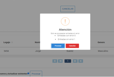 Como último paso podrá indicar si solo se agregarán legajos nuevos o si también se actualizarán los legajos preexistentes en el sistema. Al darle clic al botón “Procesar” se obtendrá un cartel con una instancia final de verificación donde el sistema muestra la cantidad de entradas con error y sin error.
