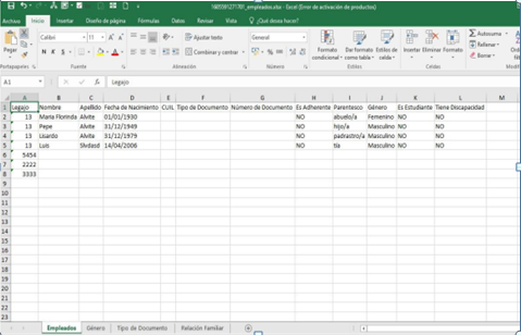 La diferencia de la carga masiva de Datos Simples es que para estos casos puede repetirse el mismo legajo en más de una fila. Para estos casos cada valor que desee agregarse deberá cargarse en una nueva fila, por ejemplo, en el caso de familiares, se repetirá el mismo legajo según la cantidad de familiares que se carguen y los datos de cada familiar irán en su fila correspondiente.