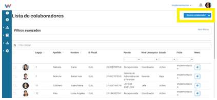 Para cargar un colaborador de manera manual deberán dirigirse al botón “Nuevo empleado” desde la lista seleccionar la ficha que corresponda y debe completar los datos previamente mencionados.