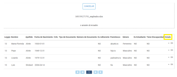 Al cargarlo se obtendrá una pre visualización de los datos cargados en el template, pudiendo verificar de mano izquierda el Estado de la carga por legajo. Si están “OK” significa que no hay errores en ese legajo, mientras que si se encuentran errores se mostrará un texto breve sobre el error de manera de corregirlo antes de procesarlo.