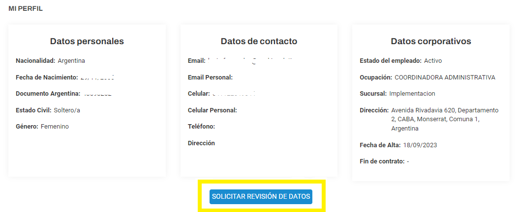 A su vez desde la funcionalidad “Solicitar Revisión de Datos” podrá enviarse una solicitud al equipo de RRHH ante el cambio de información de alguno de los campos que se visualiza, por ejemplo, ante un cambio de domicilio o correo.