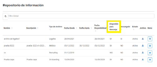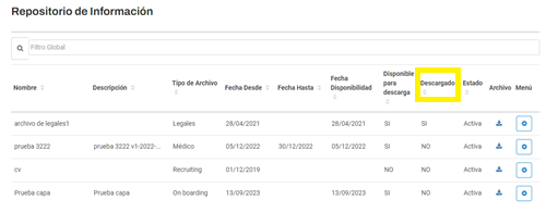 Desde el lado administrador de la ficha, además de visualizar si está disponible en el SS y su fecha de disponibilidad, también visualizará en estos casos una columna que indica si el archivo fue descargado por el colaborador: