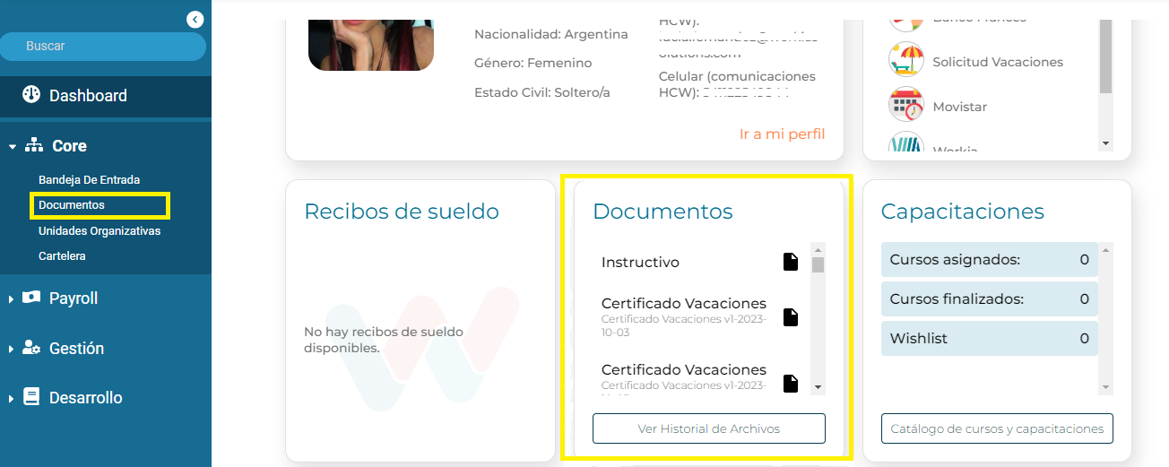 Una vez se haya cargado el archivo se tendrá acceso al mismo ingresando a la ficha de cada colaborador, o bien si se indicó que esté disponible para la descarga, el colaborador podrá visualizarlo desde su perfil.