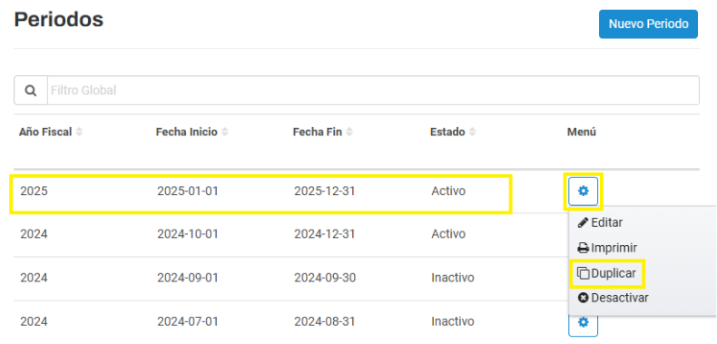 Esto creará una nueva fila en la grilla con el mismo año fiscal + Estado = "Inactivo"