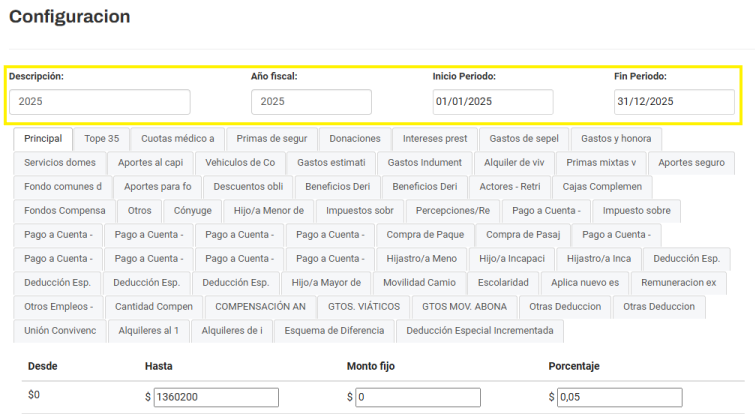 Reemplazar los 4 campos superiores con información del nuevo año fiscal y GUARDAR la información.