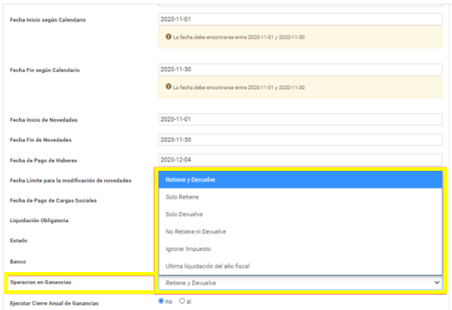 Consiste en un listado desplegable con 6 opciones que determinarán cómo debe interactuar ese Proceso / Tipo de Liquidación de ese Periodo de Liquidación específico con el módulo de ganancias y por lo tanto impactando en el resultado del Impuesto en el recibo.