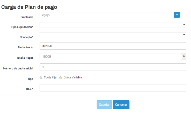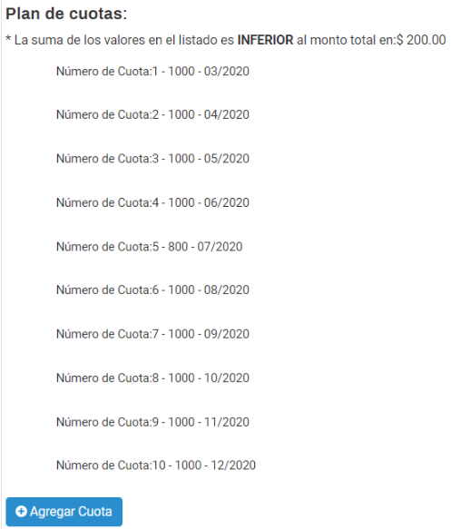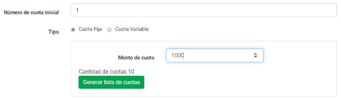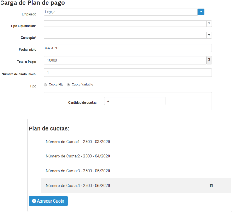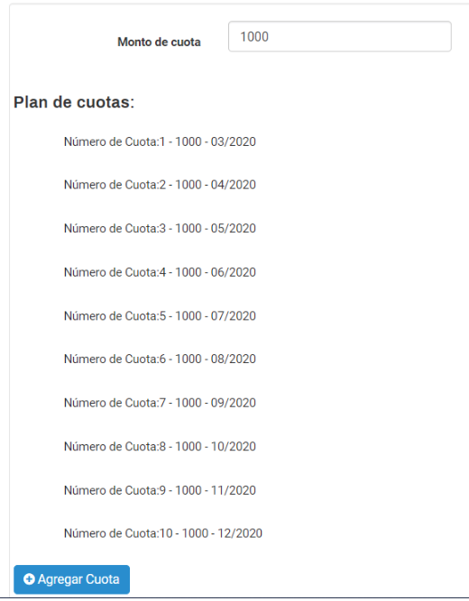 Despliega un nuevo campo denominado Monto de cuota, en el se asigna el valor de la cuota a descontar/pagar (como en el ejemplo, se cargó un total a pagar de $10.000, en cuotas de $ 1.000.) automáticamente genero la cantidad de cuotas según los datos informados (10 cuotas).