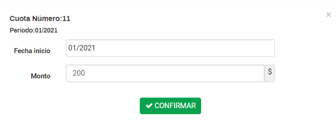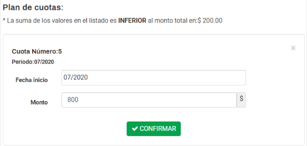 Plan de cuotas: apoyando el puntero del mouse en el número de cuota (en este ejemplo, cuota N°5), apertura los datos de la cuota y permite modificarlo. Tener en cuenta que al modificar el valor arroja un aviso sobre la diferencia de saldo, para cargar dicha diferencia en un periodo posterior (este modo de carga o diferencia lo veremos más adelante).