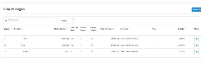 Generar Lista de Cuotas: despliega la lista de cuotas por mes a descontar teniendo en cuenta la fecha de inicio.