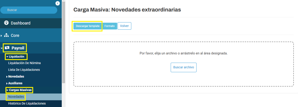 Descargar template: descarga un archivo “template-novedades-extrordinarias.xlsx”