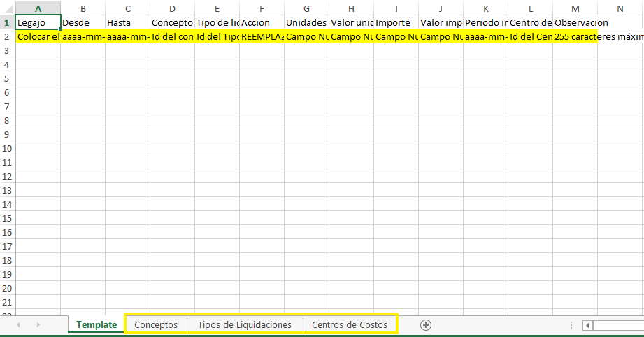El archivo tiene varias solapas de ayuda por los Id (conceptos, tipos de liquidación y centro de costos), tener en cuenta que si tienen varias empresas cargadas los id pueden variar en relación a estas, por tal motivo, previo a informar la carga masiva de novedades, aconsejamos descargar el template correspondiente, desde la empresa a la cual pertenecen las novedades a informar.