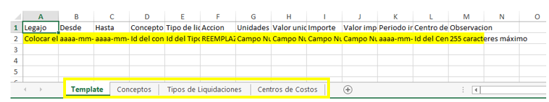 El archivo tiene varias solapas de ayuda por los Id (conceptos, tipos de liquidación y centro de costos), tener en cuenta que si tienen varias empresas cargadas los id pueden variar en relación a estas, por tal motivo, previo a informar la carga masiva de novedades, aconsejamos descargar el template correspondiente, desde la empresa a la cual pertenecen las novedades a informar.