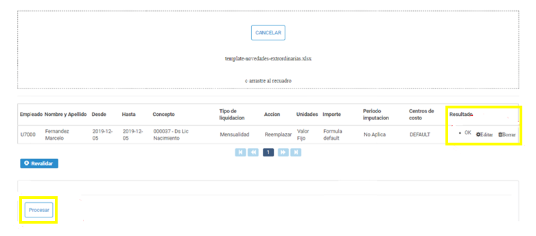 (Sugerencia, en caso de error de algunos legajos, cancelar, corregir el archivo y volver a ingresar todas las novedades