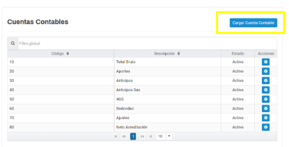 - Cuentas: Despliega la lista de cuentas creadas previamente