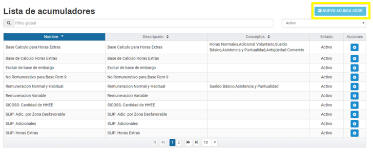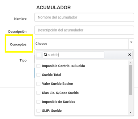 Los acumuladores agrupan uno o varios conceptos, se puede optar por referenciar a las unidades ó bien al importe de los conceptos seleccionados, para luego ser utilizado o explotado en las fórmulas (por ejemplo Remuneraciones Variables,Base remuneración normal y habitual, días de inasistencia, etc.)