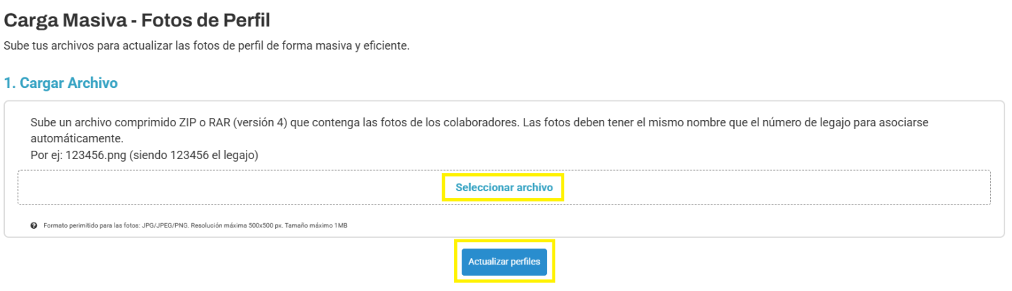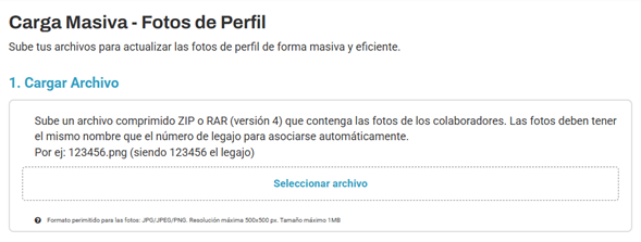 Las imágenes deben estar en formato JPG o PNG y el nombre del archivo debe ser el legajo del colaborador