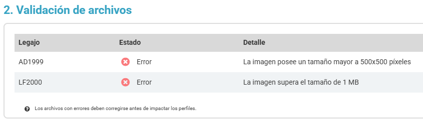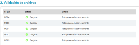 Importante: Si las imágenes tienen una resolución mayor a 500x500 px o pesan mas de 1MG, estas no serán procesadas y en la tabla de validación aparecerá el detalle del error.
